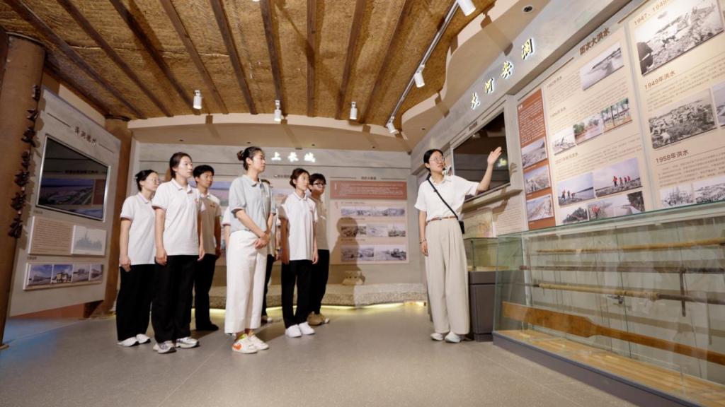 在黄河文化展厅,讲解员以“大河安澜・岁月如歌”为主题,系统讲述了德州治黄事业七十余年的发展脉络,围绕黄河自然概况、黄河文化、历代治河、新时期治河新理念与实践等多个主题,结合实物展品、历史照片与多媒体互动装置,全景式展现了黄河流域的自然地理变迁、五千年文明积淀以及历代治河实践。让师生们对黄河文化有了更深刻的认识,激发学生党员、团员要讲好黄河故事、传承弘扬黄河文化的责任感和使命感。