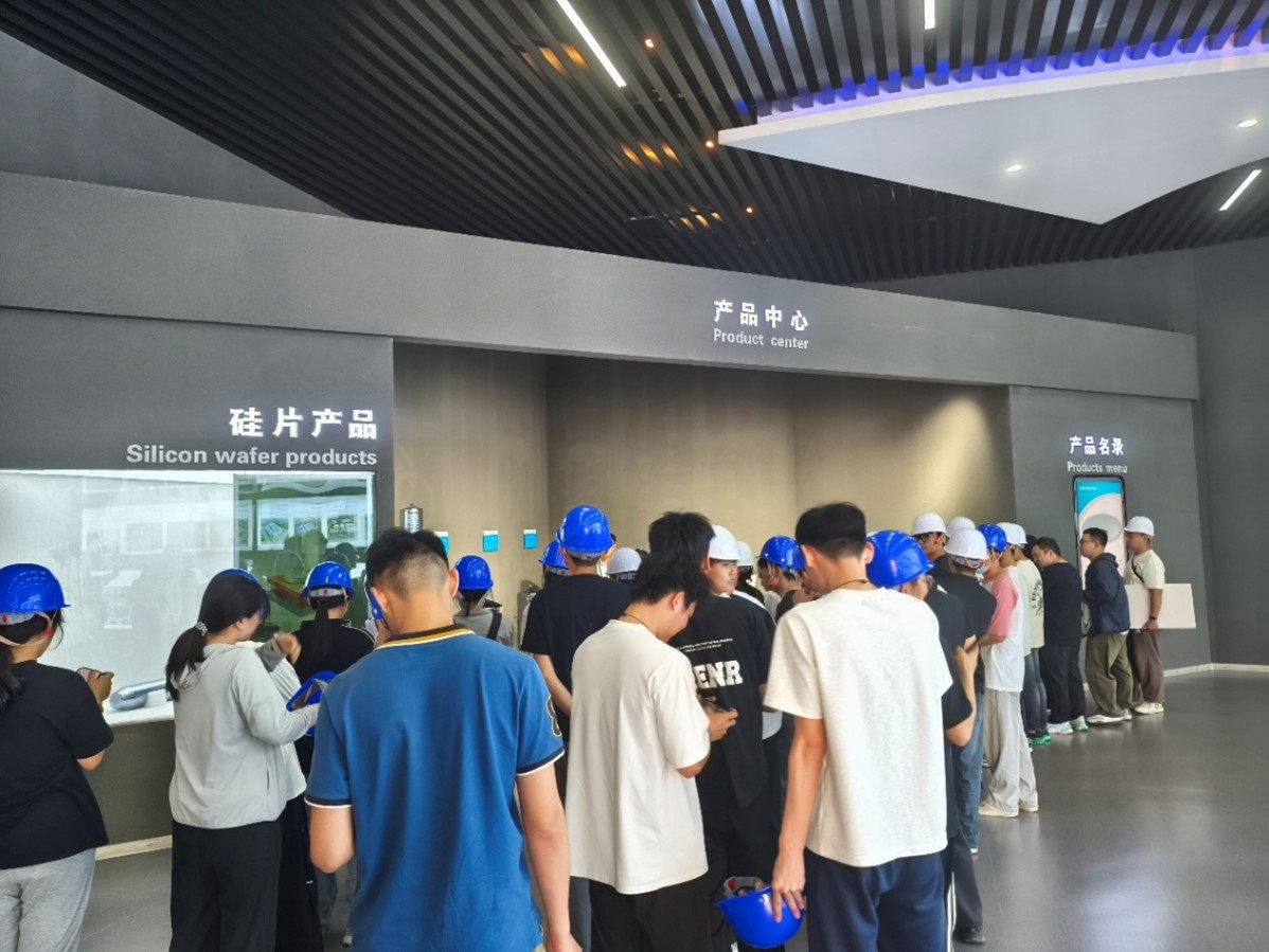 在山东有研半导体材料有限公司办公室主任张廷龙的带领下,学生们首先参观了“集成电路关键材料基地数字展馆”。张主任深入讲解了半导体行业的发展历程及未来趋势,并详细介绍了公司的发展历史和核心产品——硅单晶。这一环节帮助学生们建立了对半导体行业及其关键材料的宏观认知。随后,学生们进入生产车间,近距离观察了硅单晶的完整生产流程。从原料准备、炉内生长到后续冷却和检测,学生们全程观摩并了解了硅单晶的生长技术及生产方法。在此过程中,学生们不仅掌握了主要化学反应和副反应的理论知识,还深入理解了各工段的操作要点。
