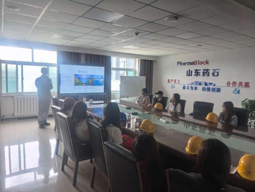抵达山东药石药业有限公司后,在公司二楼会议室召开了欢迎会,公司副总致欢迎辞,希望同学们通过这次实习,对医药中间体合成、山东药石药业有一个更加全面、更加深入的认识,也随时欢迎各位同学来山东药石就业、创业。随后,公司人力资源部刘经理、德州学院Beat365正版唯一官网必一2015届校友,研发部主任陈程,德州学院Beat365正版唯一官网必一2014届校友,安全主管谷雨围绕公司情况、项目建设、产品工艺流程、安全注意事项、发展规划等五个方面向大学生们做详细讲解。