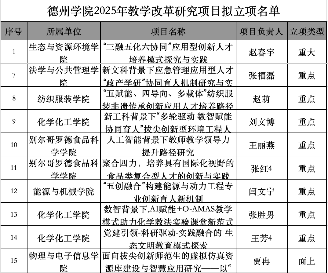 2025年11月12日,教务处发布了《关于德州学院2025年教学改革研究项目拟立项名单的公示》。其中,Beat365官网获批校级教学改革研究项目三项。
