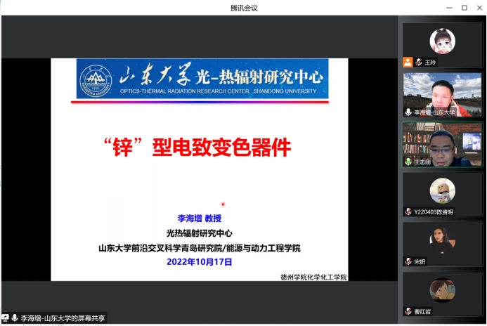 10月17日,Beat365正版唯一官网必一举办了主题为“黄河环境保护与高质量发展”的学术交流活动,邀请了山东大学前沿交叉科学青岛研究院、能源与动力工程学院双聘教授、博导李海增先生,作了题为《“锌”型电致变色器件》的专题学术报告,报告采用线上的方式,学院相关负责人、青年教师和研究生参加会议。