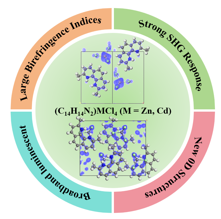 非线性光学晶体利用二阶非线性效应产生的倍频、混频、参量振荡及光参量放大等变频技术,可拓宽激光的波长范围,已应用于核聚变、医疗、水下摄影、光通信、光测距等方面,是激光技术的关键材料。有机-无机杂化卤化物材料能够将有机组分的结构柔性和功能多样性与无机组分的热稳定性结合,展现出丰富的非线性光学特性和可调的结构设计空间。本研究通过将平面π-共轭的(C14H14N2)2+阳离子基团和[ZnCl4]2-/[CdCl4]2-阴离子四面体基因有机结合,成功创制了两种具有非中心对称结构的杂化金属卤化物单晶 (C14H14N2)ZnCl4和(C14H14N2)CdCl4。这两种晶体都表现出优异的非线性光学特性,包括显著的相位匹配二次谐波发生效率(1.63×KDP和1.36×KDP)、宽的带隙(3.20和3.13 eV)和强的各向异性双折射(0.325和0.341@1064 nm)。理论研究和晶体结构分析表明,(C14H14N2)ZnCl4和(C14H14N2)CdCl4的二次谐波响应和大的双折射主要源于π共轭(C14H14N2)2+有机阳离子和畸变的[ZnCl4]2-/[CdCl4]2-四面体的协同作用。