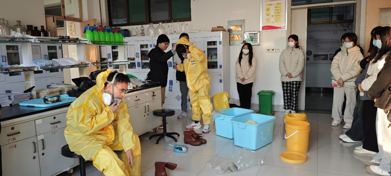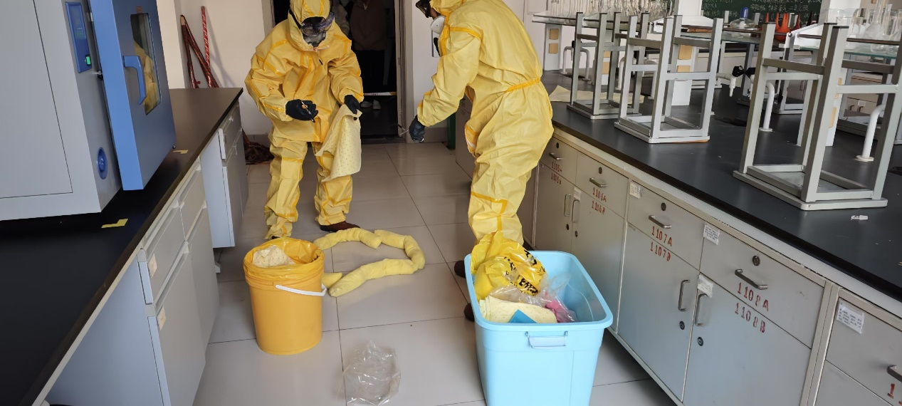 演练模拟了实验室内一位同学在进行实验时不慎将危险化学试剂打翻,导致少量喷溅到实验服上。现场模拟:事故上报、安全疏散、穿戴防护服,以及泄露处置程序多个应急环节。事故发生后任课老师迅速组织大家有序撤离现场,并及时向上级部门逐级上报事故情况,组织人员进行现场处置。在安全疏散环节,演练指导师生如何快速、有序地撤离实验室,避免泄漏对更多人员造成伤害。同时,演练还展示了穿戴防护服的正确方法,确保在处理危险化学品泄漏时,工作人员的安全得到保障。泄露处置程序和方法是本次演练的重点。