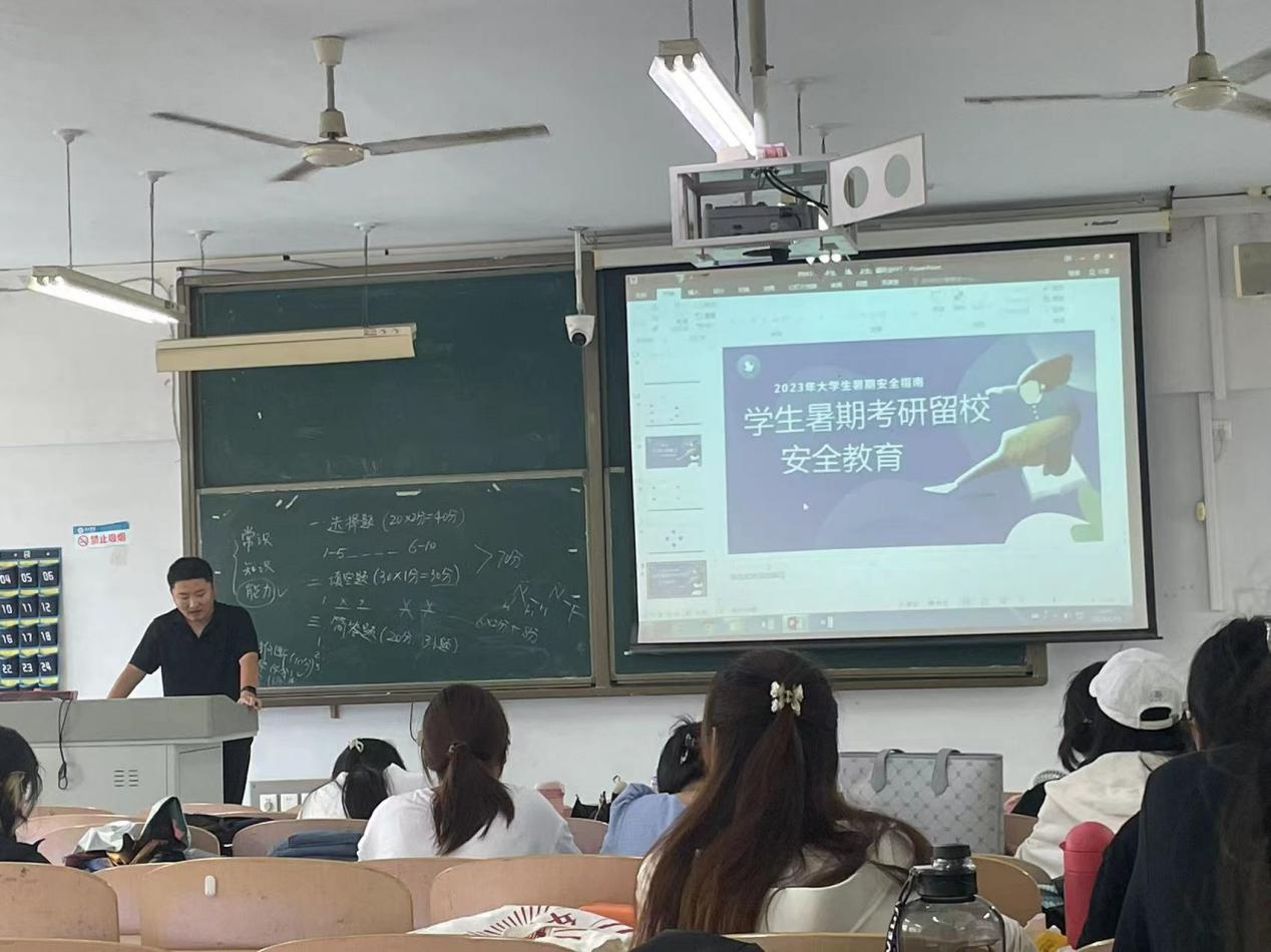 会上辅导员传达了学校关于2023年暑期学生教育管理服务工作的通知内容,要求暑期留校同学严格遵守学校管理规定,履行留校承诺,强调校规校纪、宿舍安全、交通安全、心理健康、防溺水以及反电信诈骗等方面内容,进一步增强学生安全防范意识,提升自我防范能力,守好安全底线,同时希望全体同学做好时间规划,树立坚定信心,力争实现考研成功。