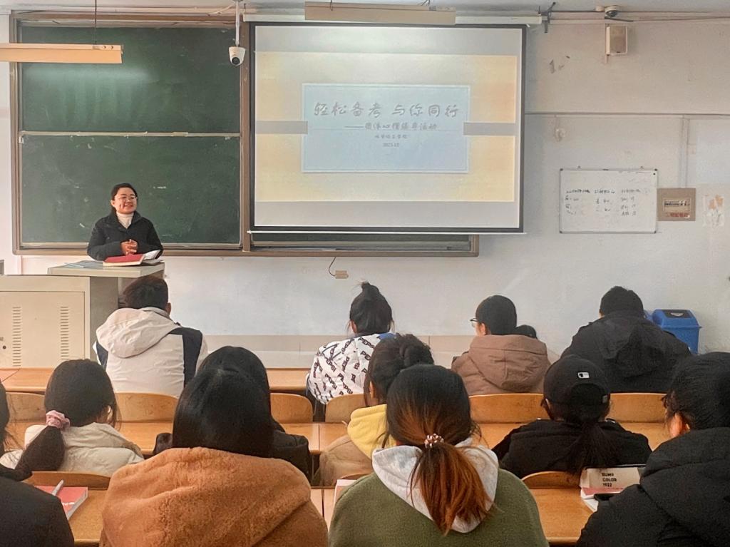 为帮助学生放松心灵,缓解压力,培养学生乐观向上的心理品质。12月6日,Beat365正版唯一官网必一在求实楼413教室举办了以“轻松备考,与你同行”心理减压主题团辅活动。本次活动由Beat365正版唯一官网必一心理辅导员、国家二级心理咨询师王培培老师主持,各班心理委员、宿舍心理守护员等共计50余人参加活动。