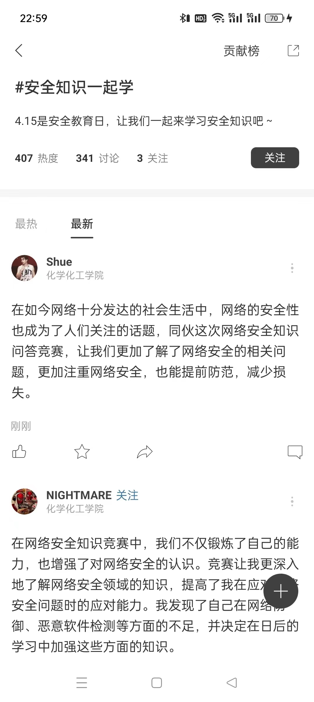 学院于12月16日到12月18日开展了“掌握安全,守护未来”网络安全知识竞赛活动。本次活动采用易班线上答题的方式普及网络安全知识,提高大学生防范网络诈骗、安全使用网络的能力,同学们参与度很高。此次活动激发了大学生深入学习网络安全知识的热情,增强了网络安全意识。