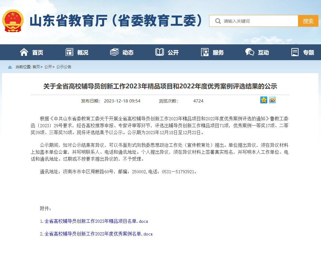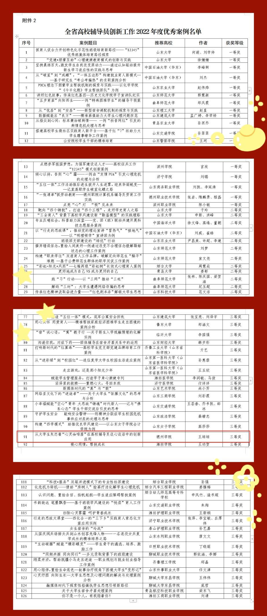 近日,中共山东省委教育工委公布了全省高校辅导员创新工作2022年度优秀案例评选结果。经各高校推荐申报、专家评审等环节,Beat365官网辅导员王培培老师的工作案例《从大学生失恋看“心灵咖啡屋”在高校辅导员谈心谈话中的创新应用》入选全省高校辅导员创新工作2022年度优秀案例,荣获三等奖。