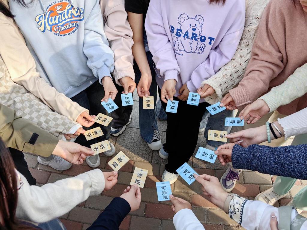 活动伊始,主持人带领同学们进行“包饺子”“心有灵犀”等一系列破冰热身活动,增进成员之间的熟悉度,营造真诚、尊重、温暖的团体氛围。接下来,带领同学们开展了“职业技能”探索,每位同学抽取职业卡牌,根据卡牌职业技能类别,分享自己现有及未来需要重点发展的技能;接着进行“职业价值观”探索,同学们选取了职业卡牌中最重要的价值观类别,与其他同学分享、讨论其决定性因素,帮助学生清晰自己的职业选择,激发职业生涯发展内在动力。最后,同学们在“心有千千结”挑战中结束了活动,感受心与心的沟通及团队的力量。同学们纷纷表示一定要立足当下,筑梦青春志在四方,规划启航职业未来。