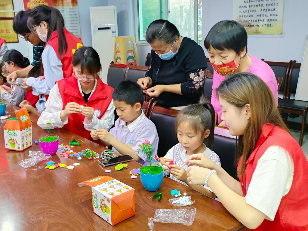 活动现场,志愿者先向小朋友们讲解了母亲节的来历,使大家对母亲节有了深刻认识,通过观看公益视频倡导小朋友也为妈妈洗一次脚、做一次饭等,引导小朋友们学会感恩和体谅母亲。随后,志愿者给小朋友们发放花束制作材料包和贺卡,并详细讲解了花束制作流程和步骤。制作过程中,小朋友们交流沟通、互帮互助,在志愿者的指导下,一盆盆纽扣花就制作完成了。小朋友们在贺卡上写下对母亲最真挚的祝福,“亲爱的妈妈,您辛苦了!”“祝妈妈身体健康、万事如意”……以此表达对母亲深深的爱意。