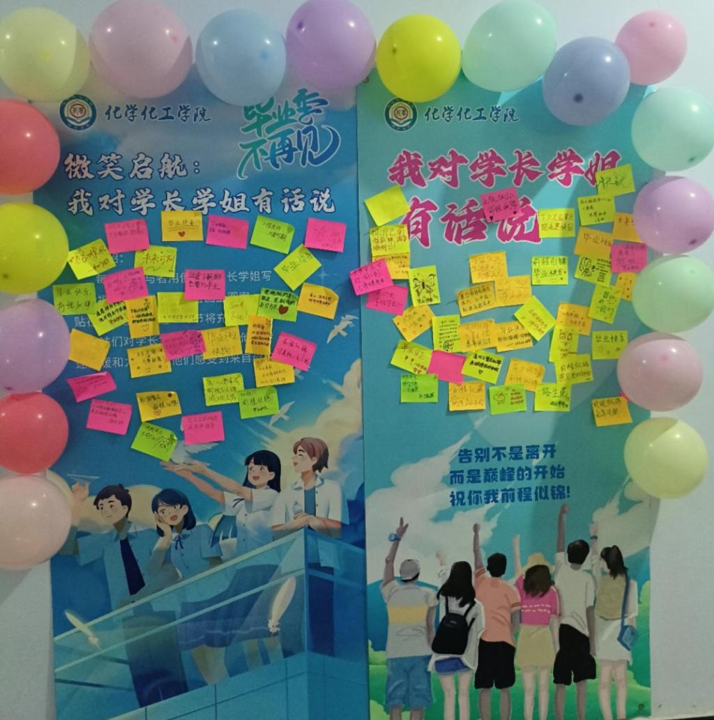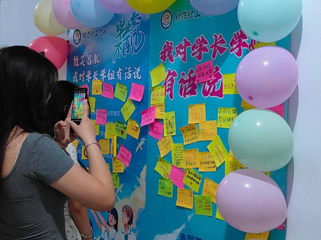 活动现场,学院精心准备了便签和马克笔,邀请同学们写下对毕业生的祝福语和鼓励话语。内容言辞恳切,表达了对毕业生深厚的不舍与美好的祝愿;有的则发挥创意,用生动的图案传递出对毕业生未来生活的美好期许。同学们纷纷驻足,或沉思或挥笔,将自己的心意化作文字,贴在特制的易拉宝上,形成了一道独特的风景线。现场还准备了开心糖果作为礼物,这份简单而贴心的礼物,不仅让毕业生们感受到了学院的关怀,也为他们的毕业季增添了一份甜蜜的回忆。活动结束后,易拉宝上贴满了密密麻麻的便签,每一张都承载着同学们的真挚情感。这些祝福和鼓励不仅是一份宝贵的毕业礼物,也将在他们未来的人生道路上,激励他们勇往直前,创造更加辉煌的未来。