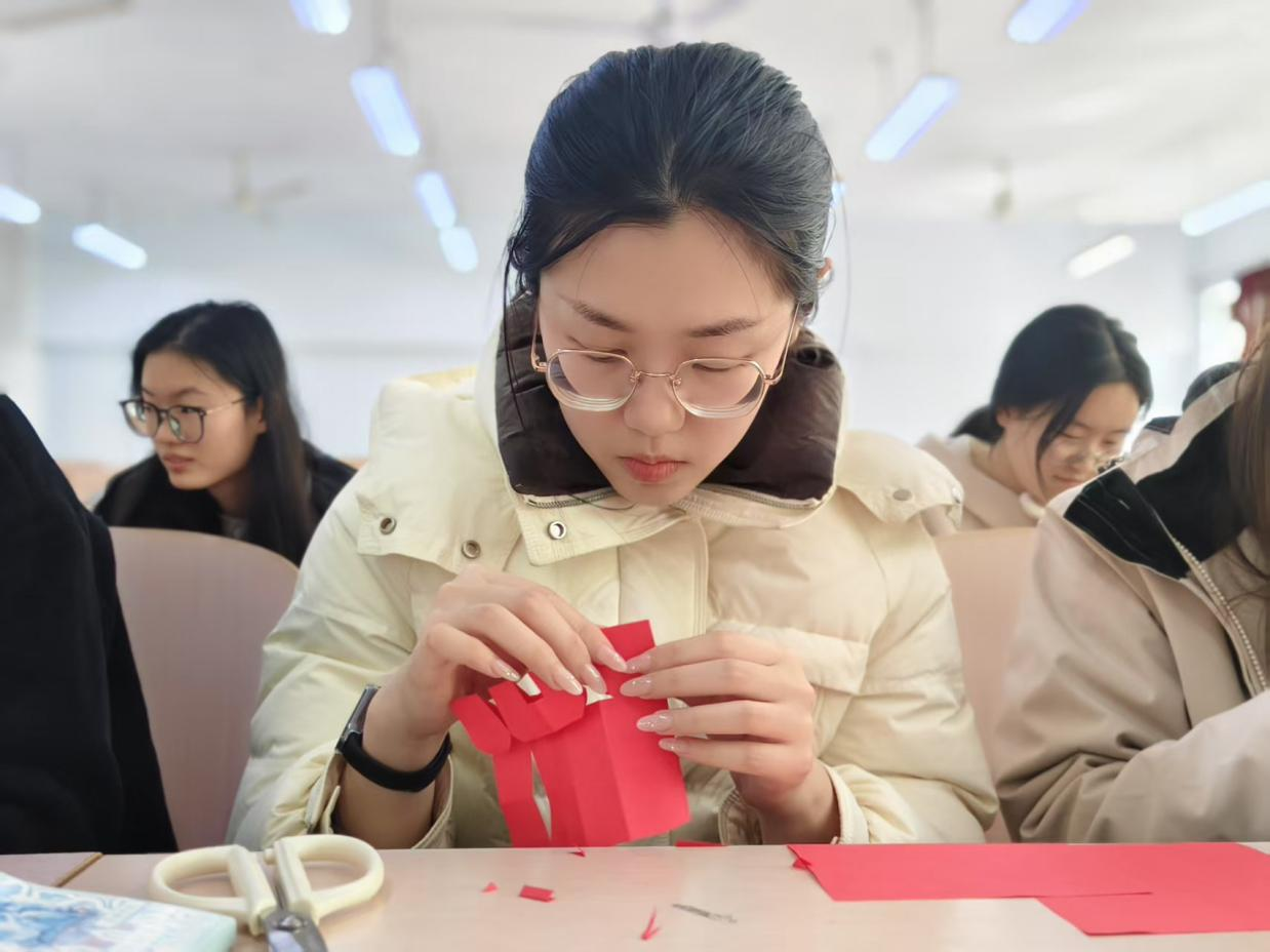 活动伊始,主讲人以《红船启航》《长征史诗》等红色经典题材剪纸作品为引,在展示作品同时,讲述作品背后承载的革命故事与红色精神内涵。随后,主讲人现场演示折纸构图、阴刻阳刻技法与镂空造型技巧,详细讲解每一个步骤的要点和注意事项。演示结束后,同学们纷纷拿起工具,全身心地投入到创作中,在动手实践中将传统剪纸技法与现代设计理念相结合,同时融入个人对红色精神的理解,作品完成后,同学们通过作品互评,交流对传统技艺传承红色思想的重要意义。