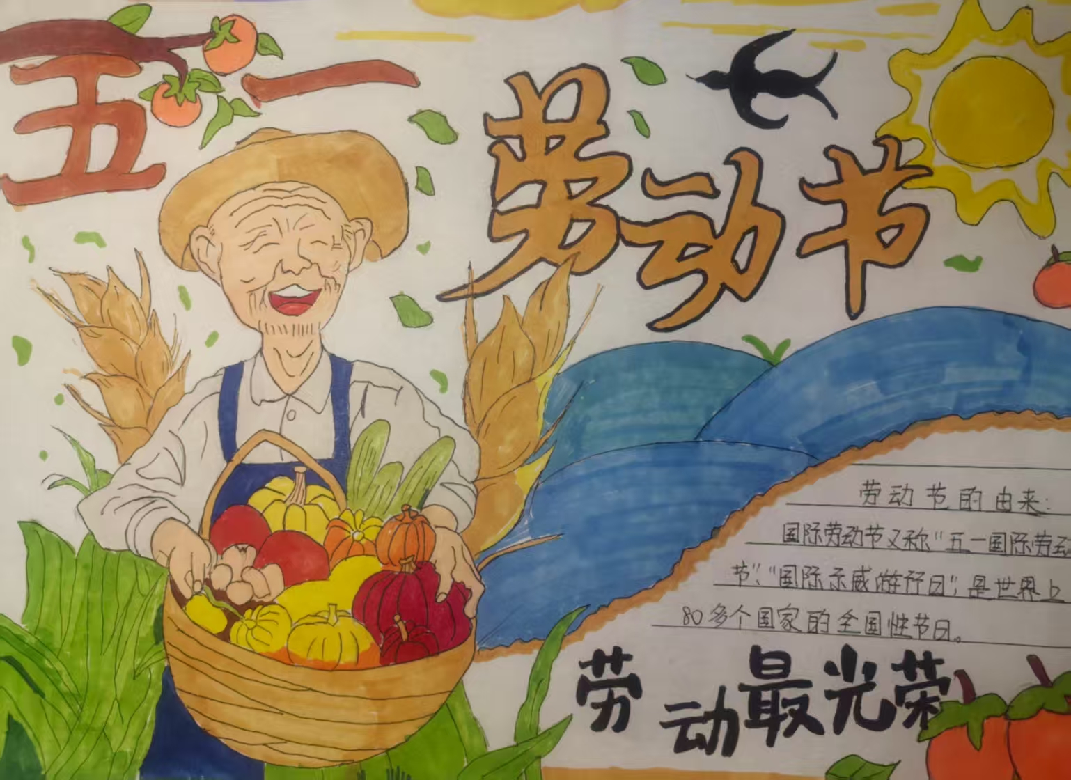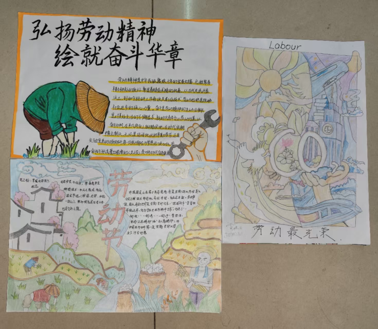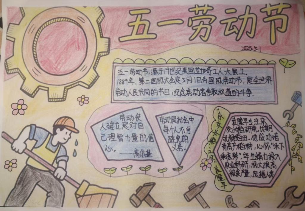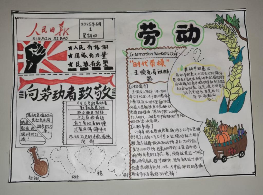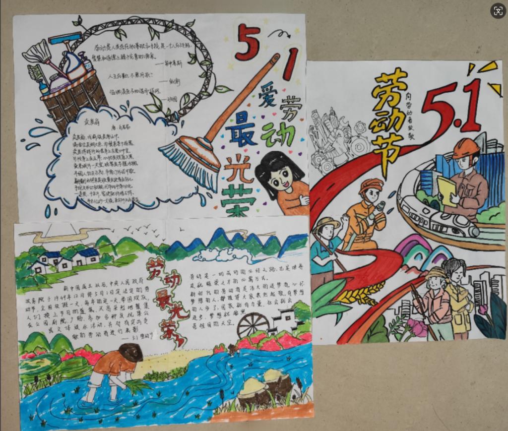 活动中,同学们以画笔为媒介,用绚丽的色彩和真挚的文字,尽情展现劳动之美,传递奋斗热情。一幅幅精心创作的手抄报精彩纷呈:有的作品细腻描绘了环卫工人、建筑工人等平凡劳动者在岗位上的动人身影,用质朴的笔触勾勒出他们辛勤付出的模样;有的则通过图文并茂的形式,讲述新时代奋斗者砥砺前行的故事,展现出拼搏进取的精神风貌;还有的聚焦校园生活,生动记录下师生们参与劳动实践的点滴瞬间,如实验室里认真完成实验操作、校园大扫除中齐心协力清洁环境等场景,每一处细节都彰显着劳动的价值与意义。