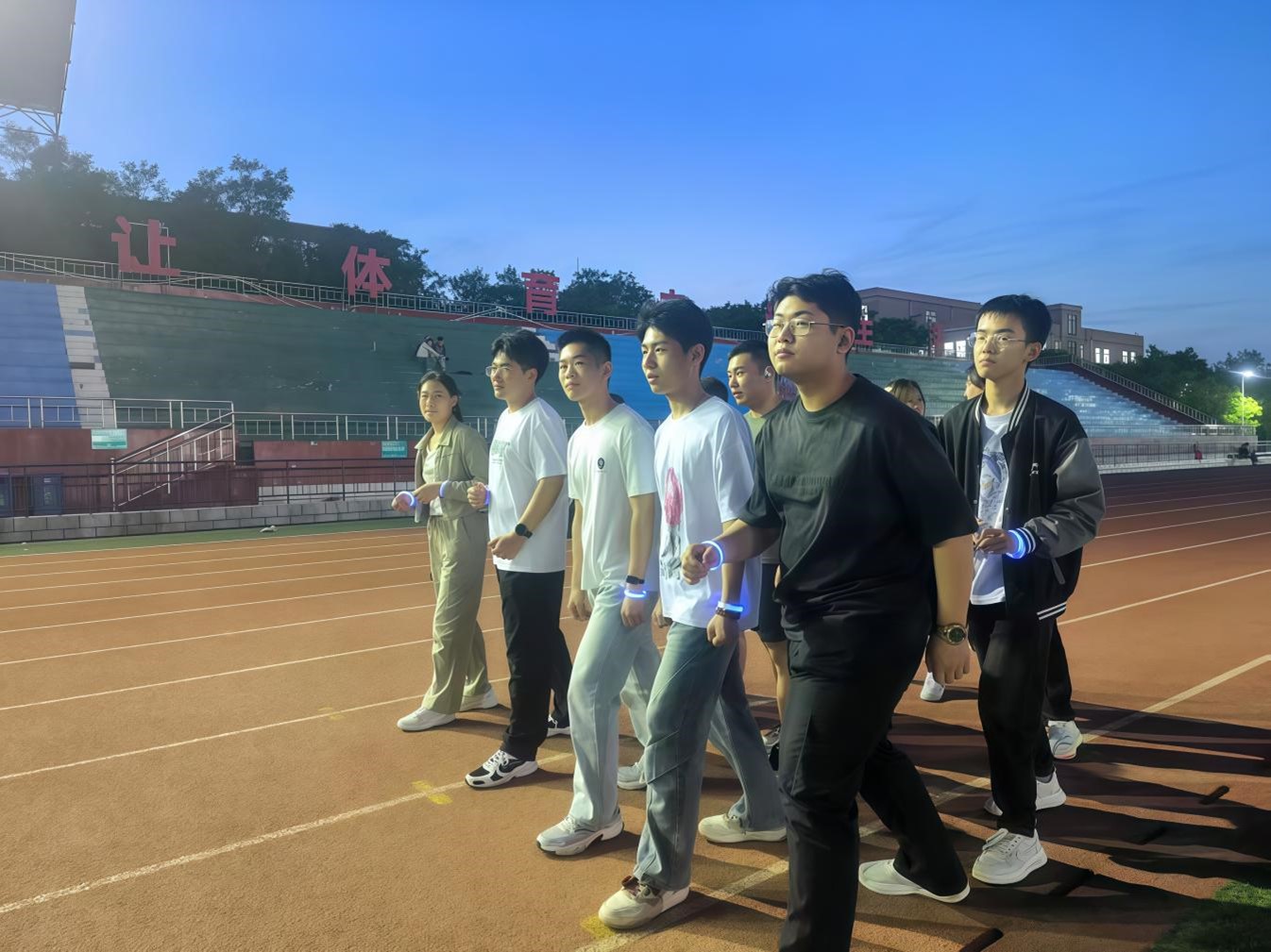 在负责人详尽讲解本次活动规则后,活动正式拉开序幕,工作人员将定制荧光手环逐一派发到学生手中,蓝色荧光带在青年腕间蓄势待发。起跑哨声划破暮色,数道流光霎时迸发。蜿蜒赛道上,跃动的光点忽而聚作璀璨星云,忽而散作彗星轨迹;你追我赶中传递着鼓励的呼声,喘息与欢笑谱写成青春的乐章。冲刺时刻,荧光阵列如银河倾泻涌向终点。活动结束后,负责人公布名次,为参与者颁发奖品。