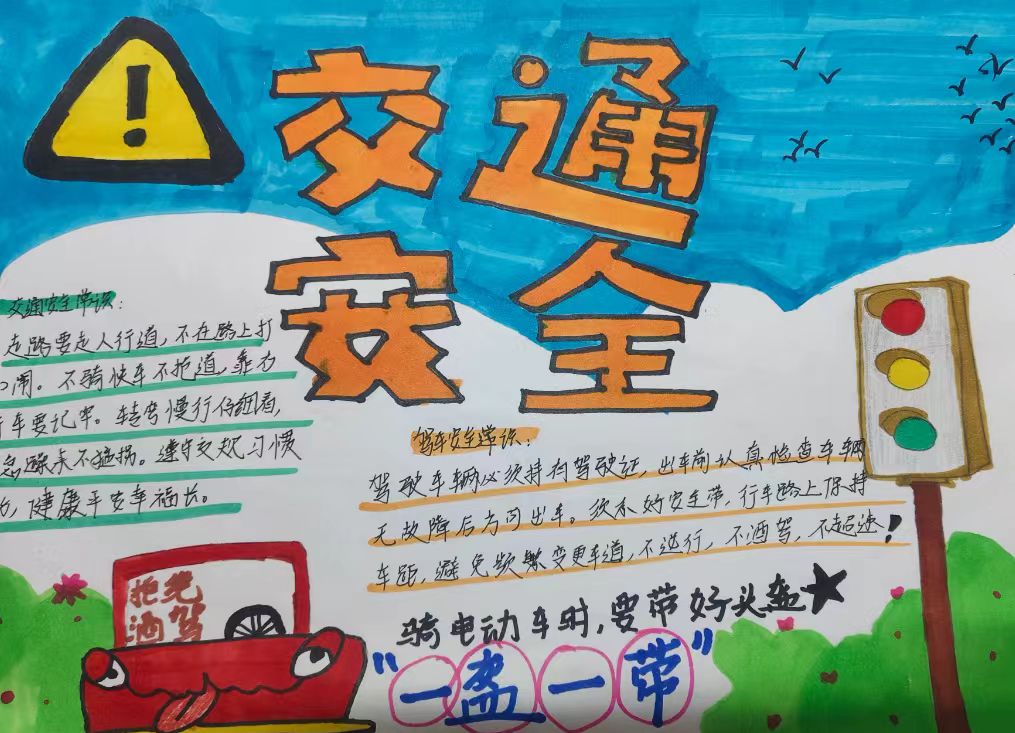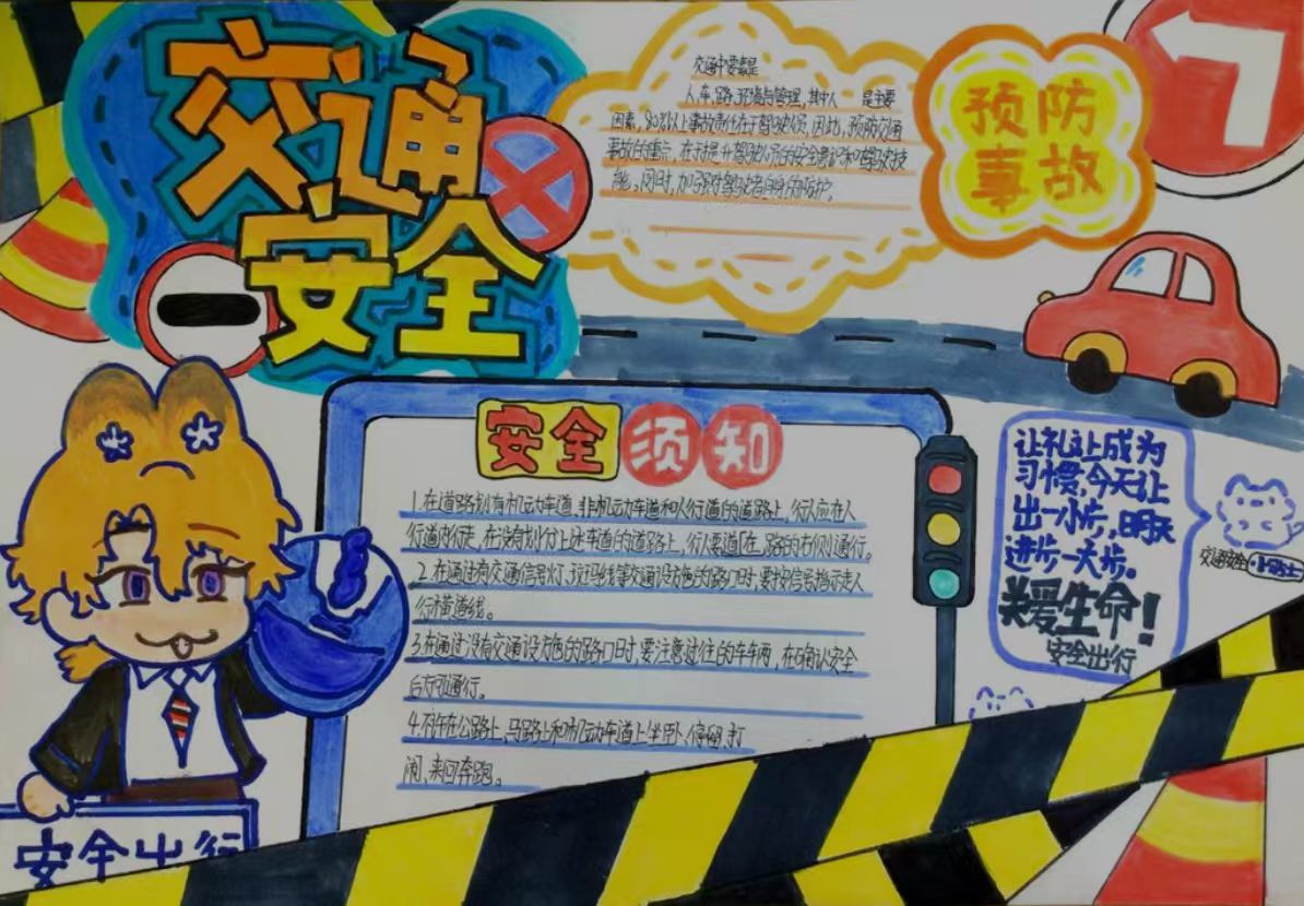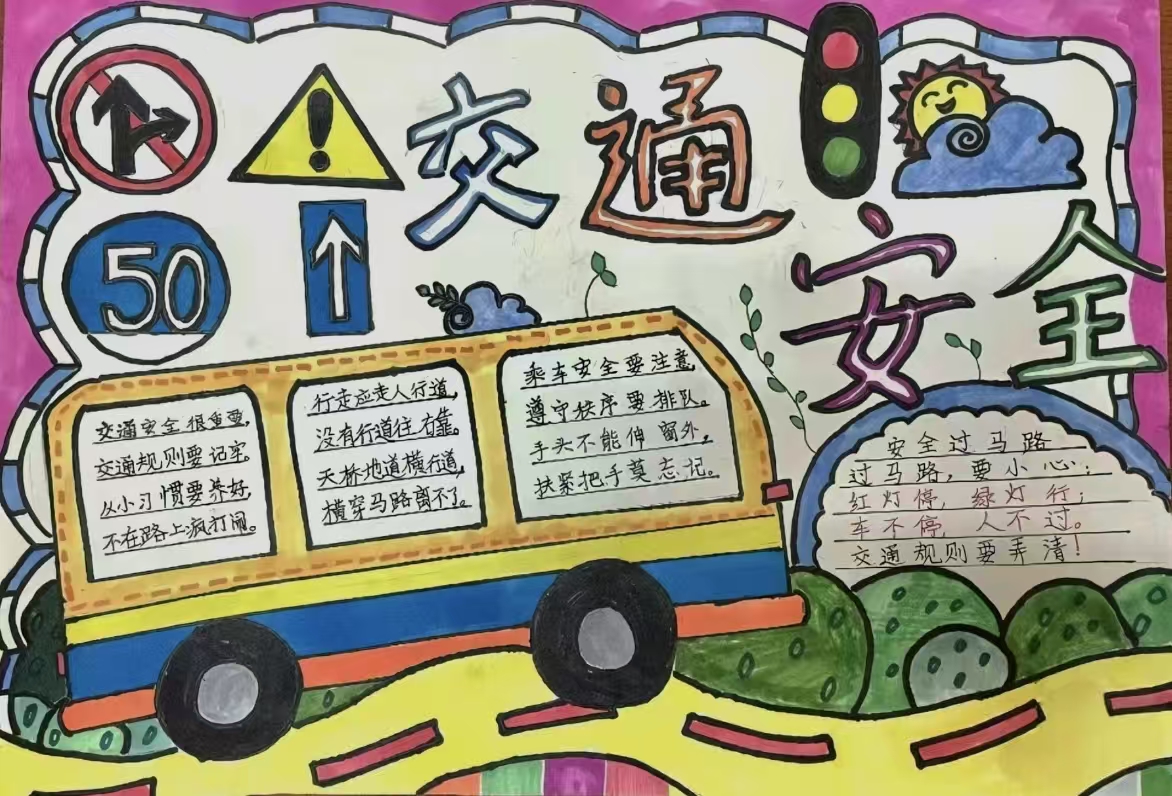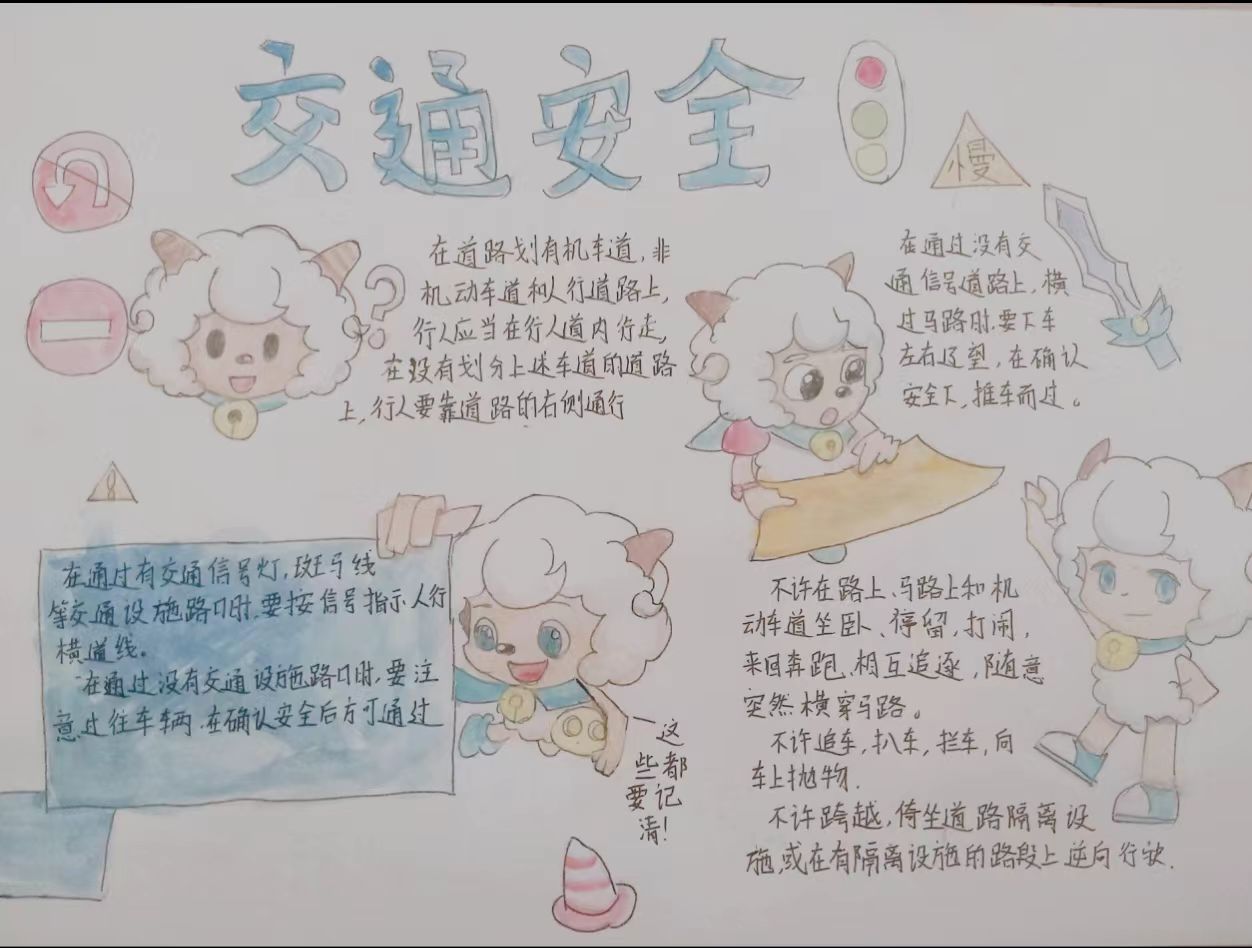活动过程中,同学们围绕“行人安全须知”“骑行规范”“乘车礼仪”三大核心内容进行创作。他们将交通标志、安全口诀与生动活泼的插画巧妙融合,创作出主题鲜明、内容丰富的作品。这些作品既传达了交通安全知识,又通过形象直观地表达增强了教育的趣味性和感染力。
