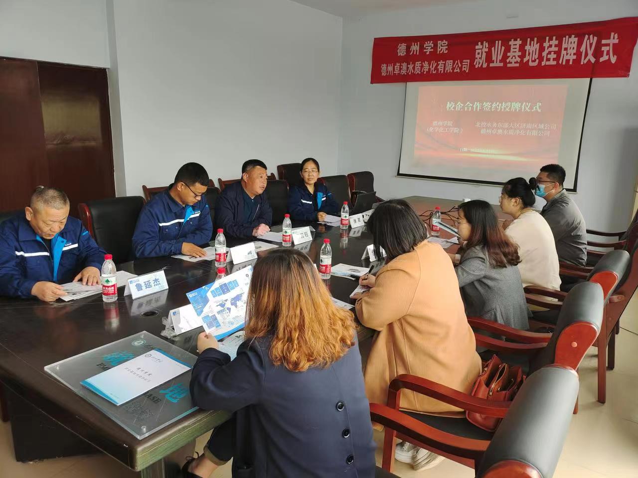 仪式上,公司总经理详细介绍了公司发展历程,工业废水、生活废水的处理流程及公司发展战略,希望能够加强校企合作,织就“共生共赢”网。Beat365正版唯一官网必一党委书记就学院的师资力量、人才培养模式、学生就业工作、科研情况做了详细介绍。双方一致认为,要将学校基础研究的优势与企业科技创新活力相结合,在高层次人才共享、联合研发平台建设以及学生就业等方面开展深度合作,共同服务地方经济社会发展。随后,双方签订《德州学院就业基地共建协议书》《实习实训基地协议书》,并进行授牌。