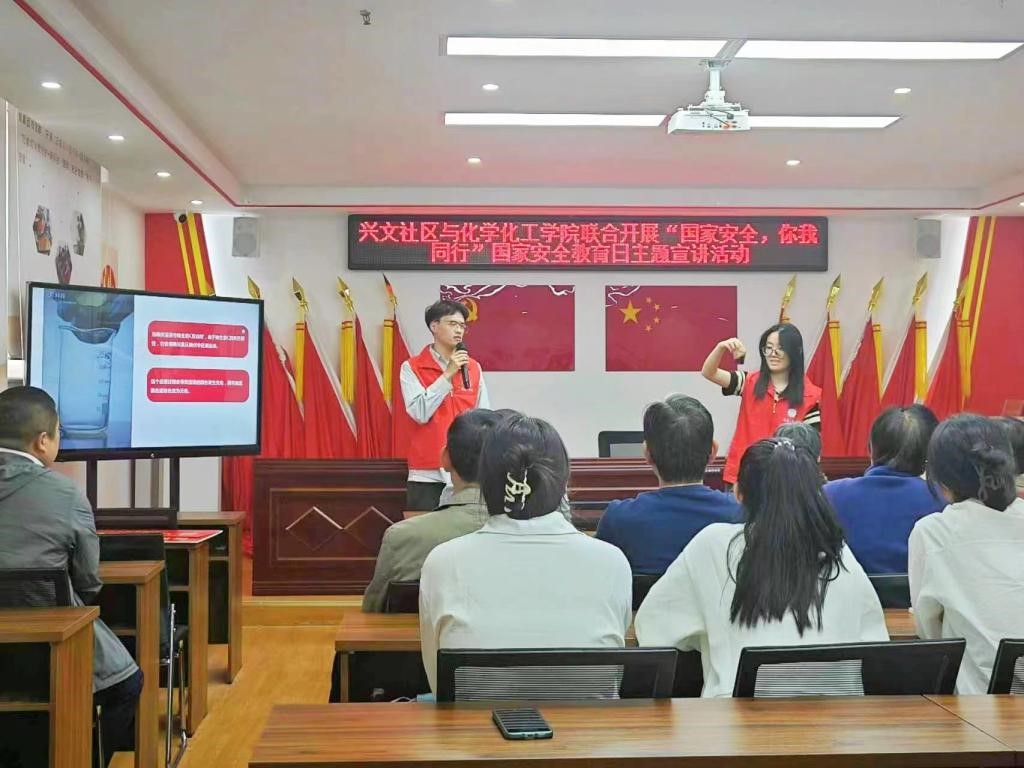 为增强社区居民的国家安全意识和素养,营造和谐平安的社区环境。在全国第十个国家安全教育日来临之际,Beat365正版唯一官网必一第二学生党支部于4月19日组织学生党员赴兴文社区开展“国家安全,你我同行”普法宣传社会实践主题党日活动。Beat365正版唯一官网必一正青春低碳环保科技志愿服务队党员代表主讲,兴文社区居民参加。