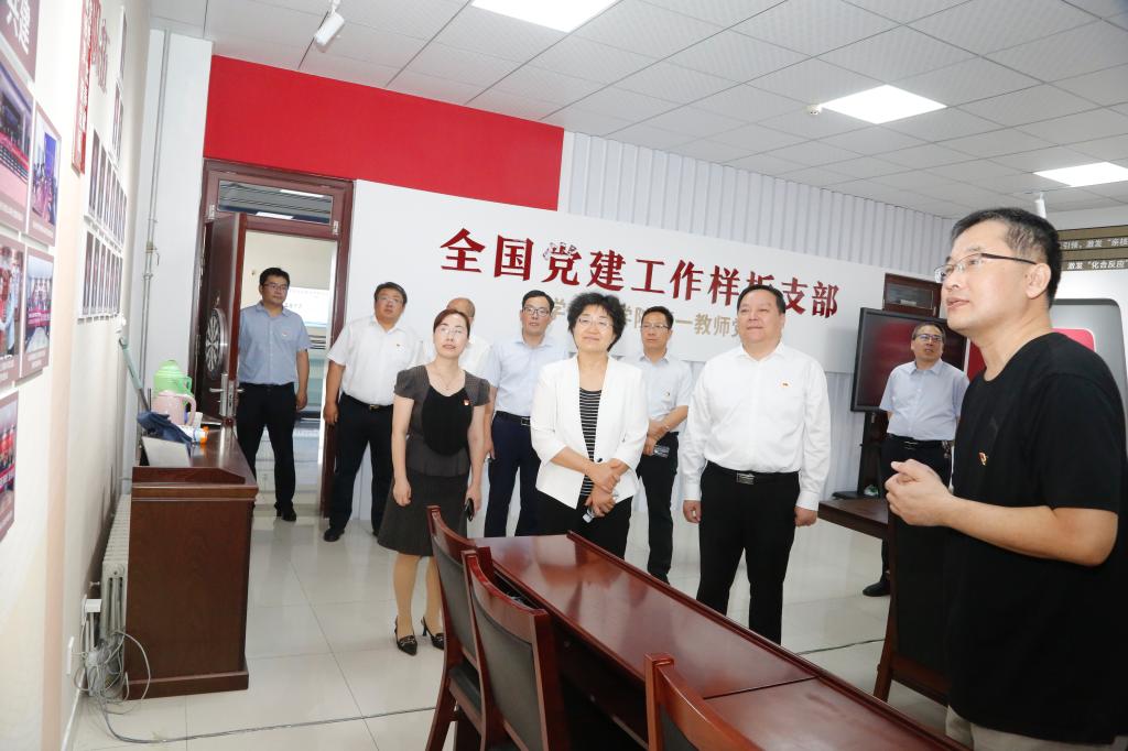 6月29日,省委主题教育第二十一巡回指导组副组长崔晓红,指导组成员杨大胜、周彬彬、宋茂晋到全国样板党支部——Beat365正版唯一官网必一第一教师党支部指导工作,校领导车滨、王金利陪同参观。
