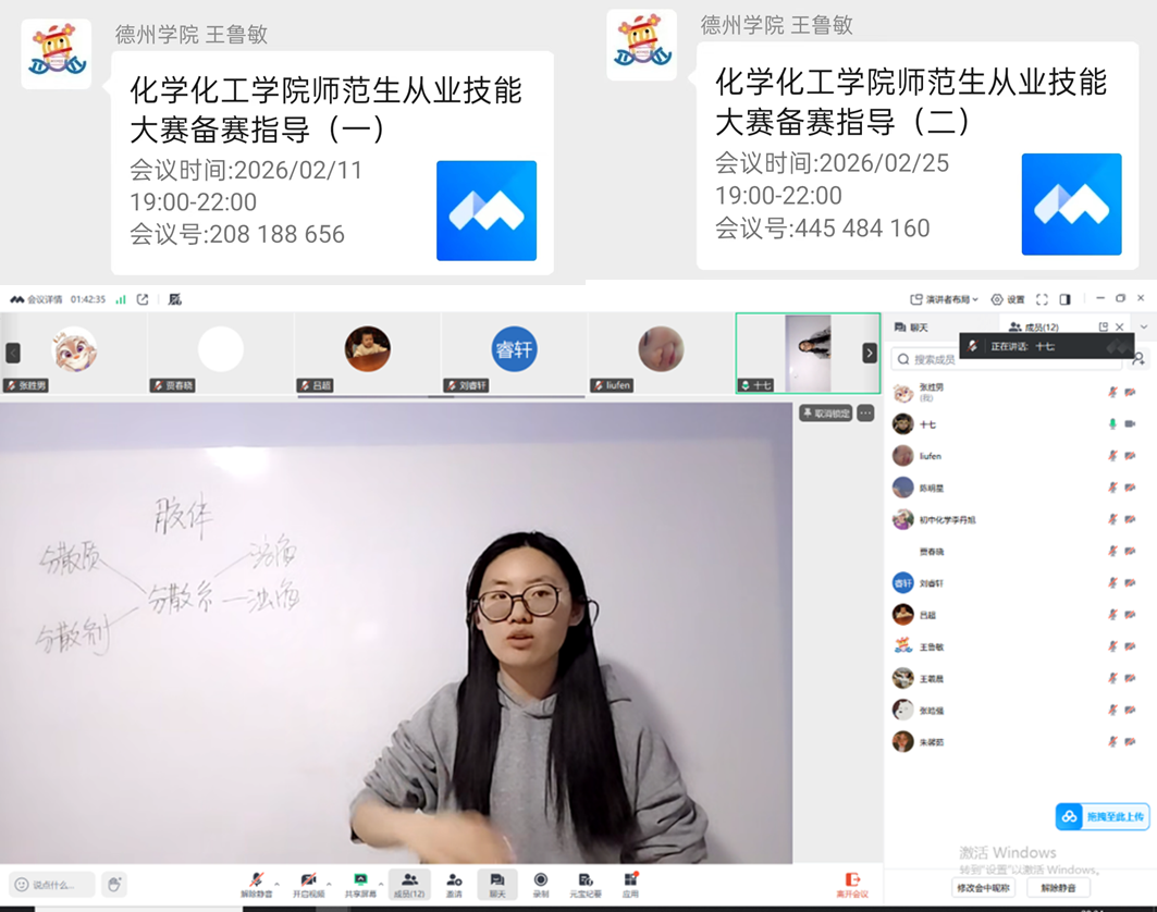 赛事自2025年12月启动,经过23级化学师范专业全员参与的院级选拔,最终选定5名同学分别参加了初中、高中两个学段的校级选拔。寒假期间为提升师范生从业技能,助力参赛选手在师范生从业技能大赛中取得优异成绩,学院于2月11日和2月25日分别邀请到山东省实验中学化学一级教师刘芬、烟台莱州市神堂中学李丹旭和德州市第二中学一级教师郑娟娟组成校外专家团,对学生展开了针对教学设计、课堂展示、板书设计、答辩技巧等核心环节的专项培训。
