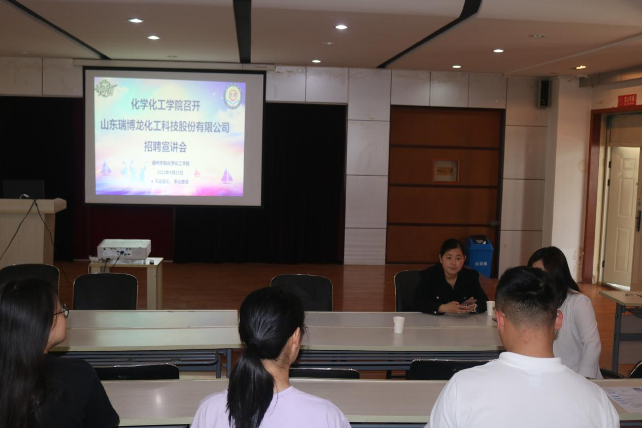 宣讲会上,山东瑞博龙化工科技股份有限公司经理围绕企业的发展历程、薪资待遇、人才需求、公司福利、升职要求等方面进行了详细的介绍,并与毕业生们积极互动,现场答疑。会后,有4名毕业生在215进行面试。