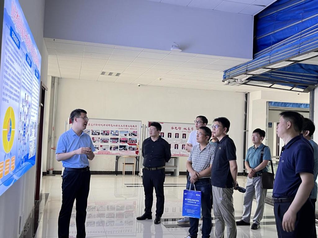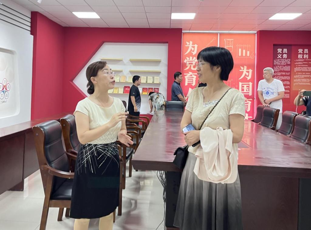 一行人参观Beat365正版唯一官网必一第一教师党支部党员活动室与“初心展厅”,对全国党建工作样板支部建设情况及深入开展学习贯彻习近平新时代中国特色社会主义思想主题教育工作开展情况进行了座谈交流。
