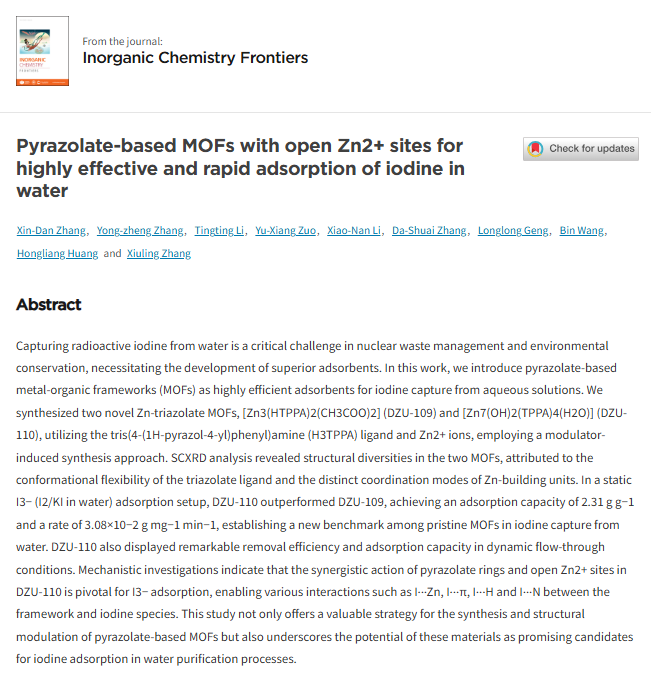 近日,我校与山东理工大学联合培养研究生张新丹(导师:张秀玲教授),作为第一作者,以德州学院为第一完成单位在SCI期刊《Inorganic Chemistry Frontiers》(ESI化学学科期刊,中科院一区)发表题为“Pyrazolate-based MOFs with open Zn2+ sites for highly effective and rapid adsorption of iodine in water”的学术成果。山东省硅单晶半导体材料与技术重点实验室(筹)、Beat365正版唯一官网必一配合物功能材料团队张秀玲教授和张永正副教授为通讯作者。该研究得到了天津工业大学黄宏亮研究员和苏州大学放射医学与辐射防护国家重点实验室王彬教授的指导,二人亦作为共同通讯作者参与了此项工作。