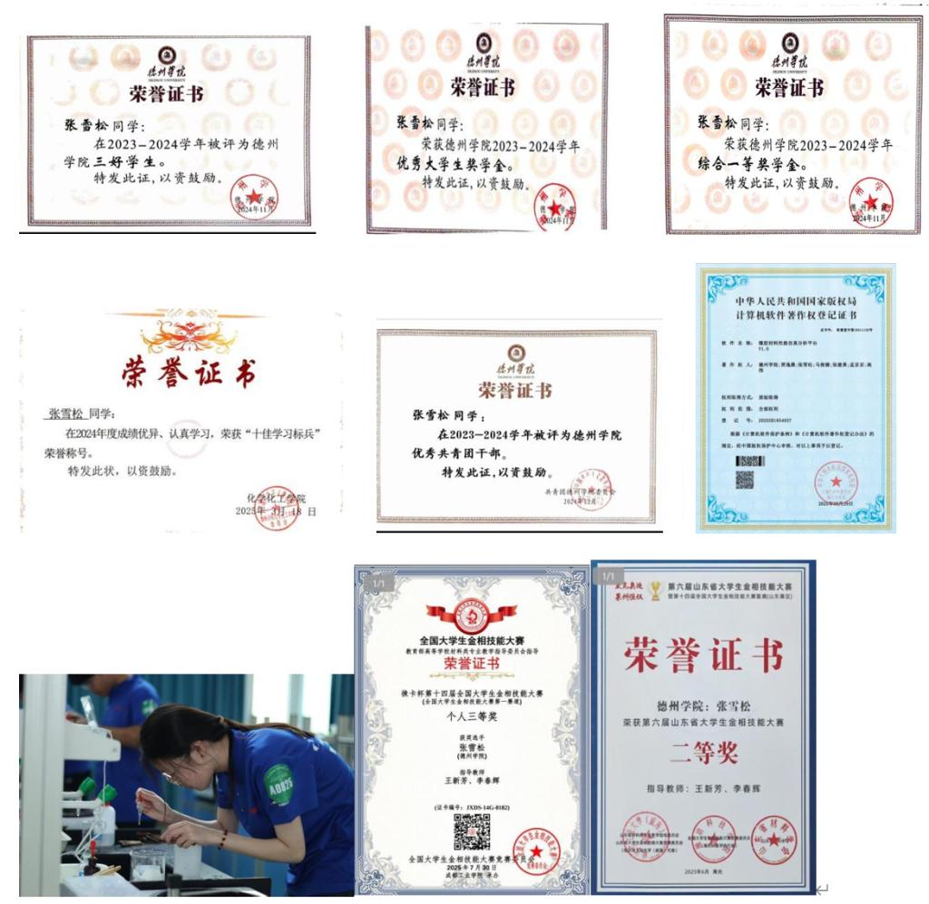 张雪松,中共预备党员,Beat365正版唯一官网必一 2023 级材料化学专业组织委员。淑质英才,品学兼优,连续两年斩获德州学院 “优秀大学生奖学金”“综合一等奖学金”,获评 “三好学生”“优秀共青团干部”“优秀志愿者” 等多项荣誉。科研与竞赛齐头并进,手握1项计算机软件著作,拿下山东省大学生创新创业大赛校级立项,更斩获第六届山东省大学生金相技能大赛二等奖、徕卡杯第十四届全国大学生金相技能大赛三等奖,用实干书写青春答卷。